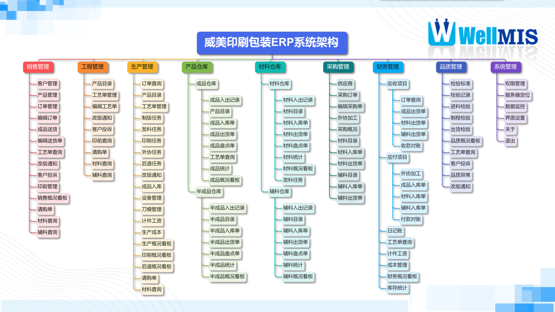 ● 整個(gè)系統(tǒng)架構(gòu)覆蓋公司各個(gè)層面,各部門之間數(shù)據(jù)緊密結(jié)合,業(yè)務(wù)流程清晰,系統(tǒng)模塊之間相互關(guān)聯(lián),形成一個(gè)完整的企業(yè)管理體系。